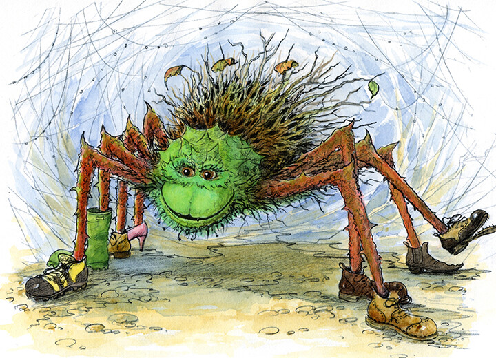 If you hear clomping in the deep woods, it might be a huge Thornyclod Spider. It wears different shoes on each foot because you can’t buy shoes in eights. It cooks delicious marshmallows using only the finest real marsh.